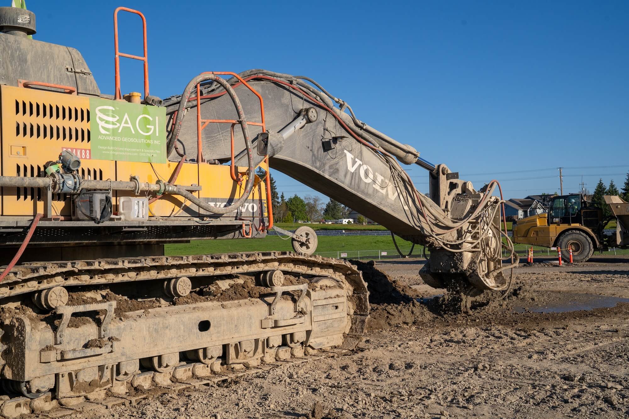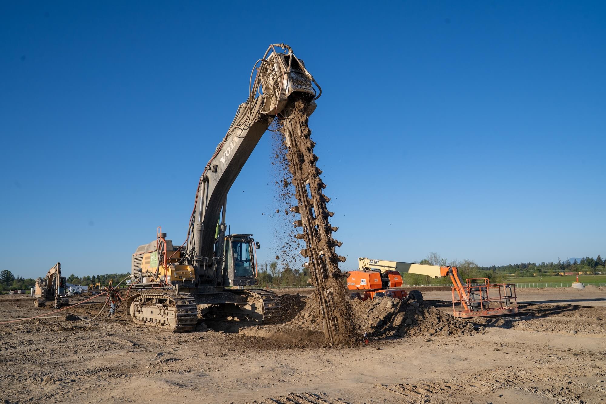 AGI designed and constructed the Deep Soil Mixing ground improvement system for Project DeLorean in Millersburg, OR. Upon contract execution AGI completed design, received permit approval and deployed 2 batch plants, 2 trench mixing units, and 1 rotary drill rig in under 5 weeks. The Trench Soil Mixing (TSM) & Deep Soil Mixing (DSM) installed as closed cell grids was economized via trench mixing technology which enabled AGI to install over 92,000 cubic yards of treated soil in less than 9 weeks. Soils were treated to depth of 30-ft and 33-ft utilizing 2-ft and 3-ft trench mixing and 4-ft diameter DSM concurrently. AGI’s design mitigated the effects of consolidation and liquefaction settlement to support building footings, slab-on-grade, and heavily loaded process equipment foundations.